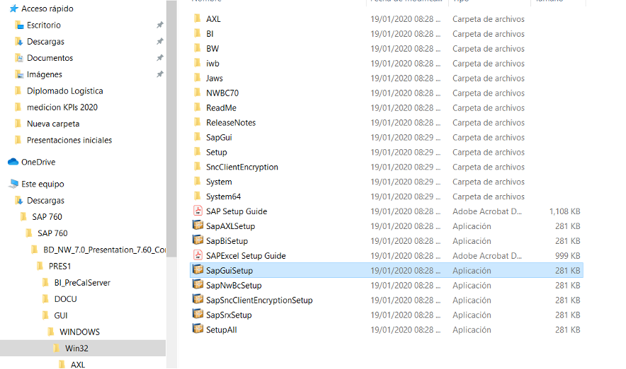 Una vez que se descarga el archivo “SAP 770.zip” se debe descomprimir, es importante que se descomprima en un folder (no ejecute el instalador sin haber descomprimido por completo la carpeta) e ir hasta la carpeta Win32 (ver imagen de abajo, marcado en amarillo). Una vez que llegamos a la carpeta Win32 debemos ubicar el archivo “SapGuiSetup” y dar doble clic para iniciar la instalación.
